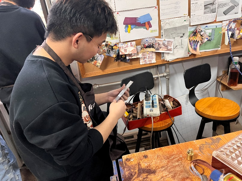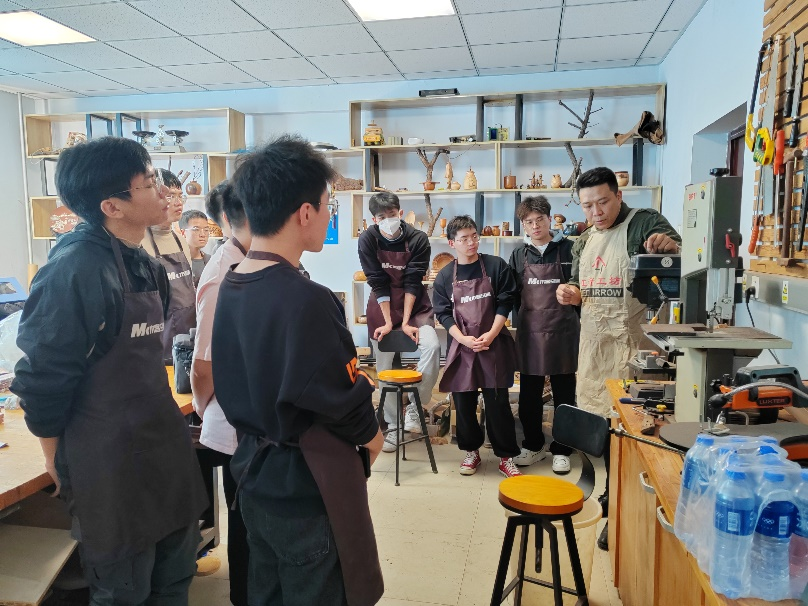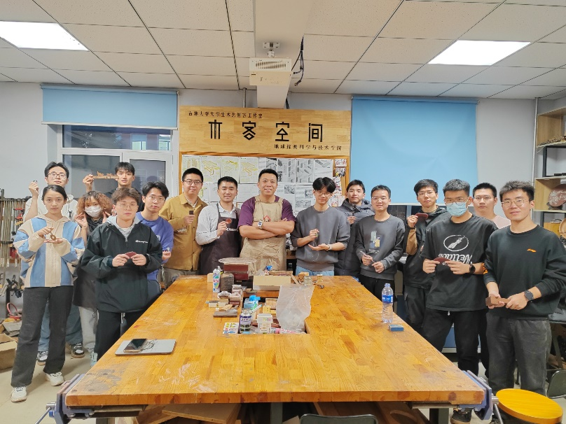 以吊坠为例,先准备好原料,确定好形状后开始打磨,需要经过细磨、水磨、开孔、抛光、系绳等多道工序后才能成型。同学们通过四个小时的亲手操作,对木工艺术有了更多的了解和认识。艺术点缀生活,制作成功的成就感是无法用言语形容的。制作结束后,同学们互相拍照留念。