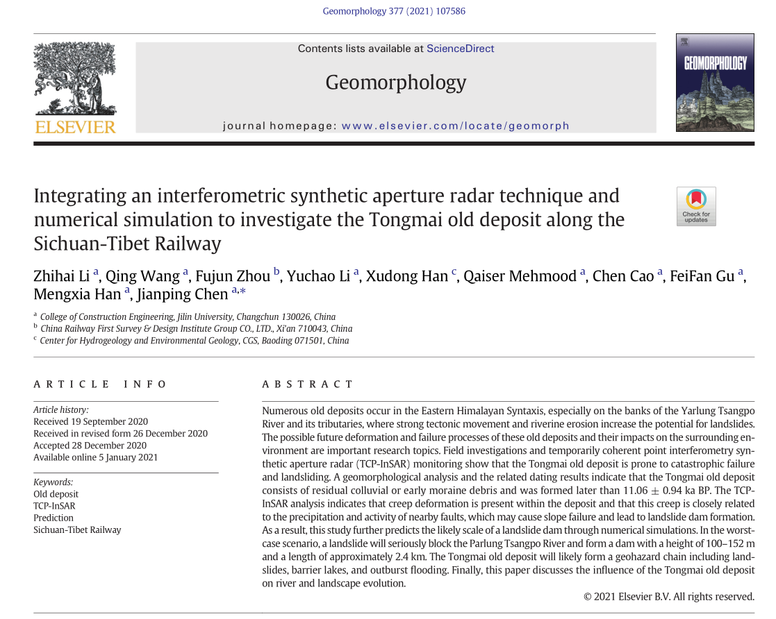 2021年1月,英国上市公司365陈剑平教授团队,在国际著名学术刊物《Geomorphology》上发表题目为“Integrating an interferometric synthetic aperture radar technique and numerical simulation to investigate the Tongmai old deposit along the Sichuan-Tibet Railway”的论文,阐述了新建川藏铁路通麦古堆积体成因和变形演化序列的研究成果,对川藏铁路选线和地质灾害链的认识及防治等方面具有重要的意义。