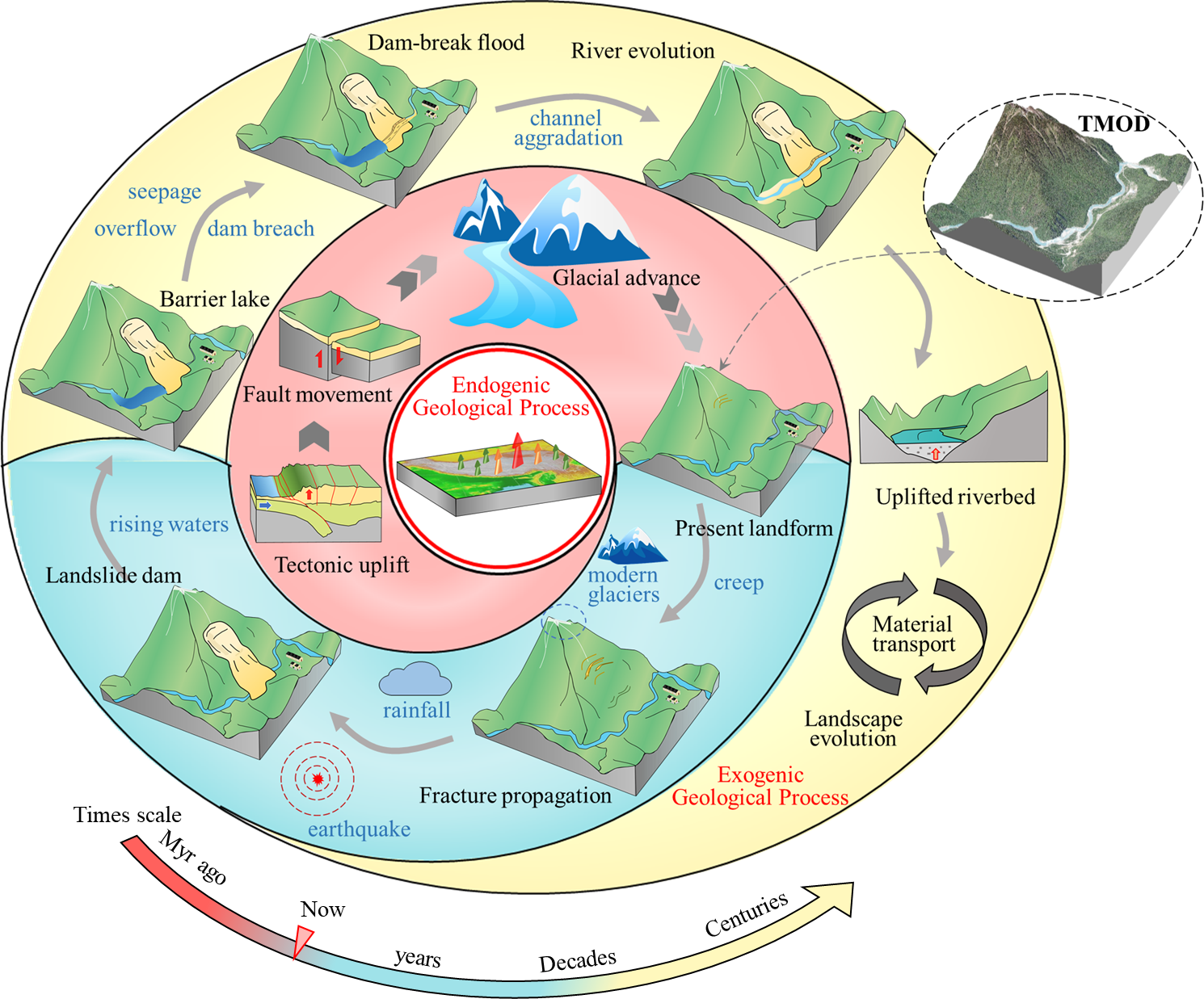 研究进一步发现通麦堆积体可能形成的地质灾害链是藏东南一种典型的物质运移机制,深刻影响着河流和地貌景观的演化。上新世以来冰川活动是藏东南堆积体形成的一个主要成因,广泛分布川藏铁路沿线的高陡边坡之上,它们的存在影响着区域地貌演化和物质运移,更影响着邻近的工程建设的安全运营。利用InSAR和数值模拟等多种手段联合,可为此类堆积体变形问题提供良好的预测。