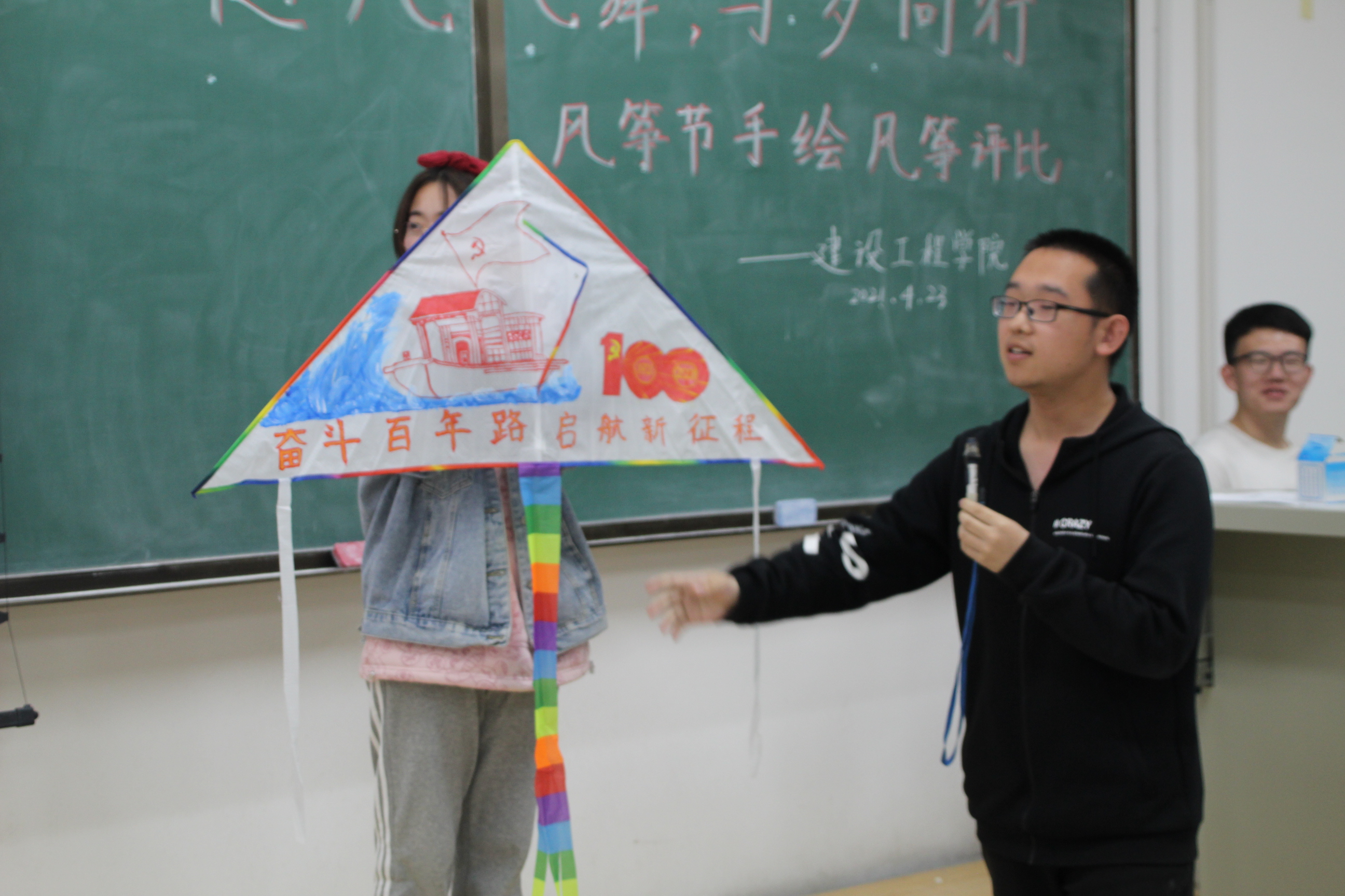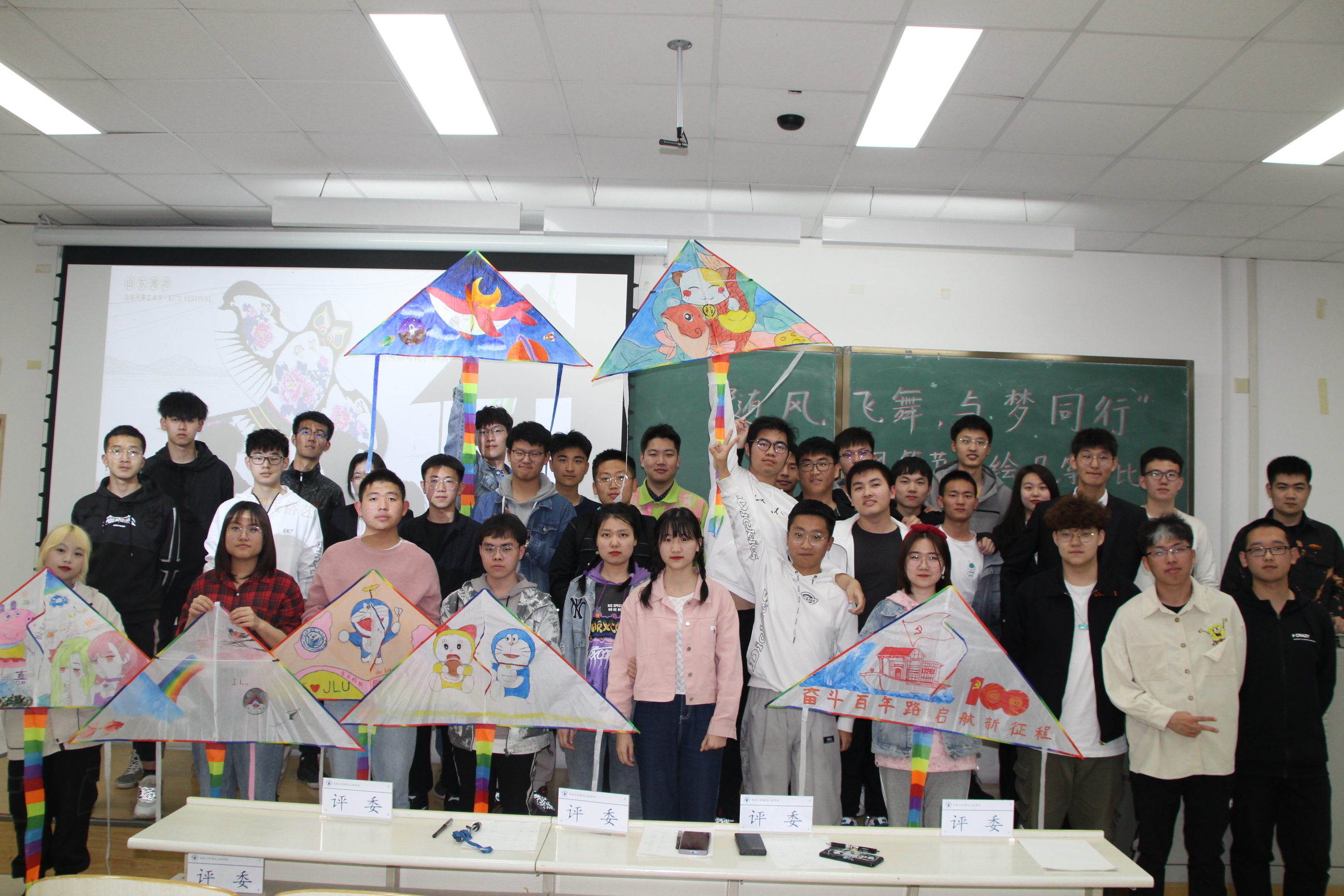 活动伊始,主持人对活动流程进行简要介绍,随后各参赛队伍进行风筝展示,并由代表人轮流叙述风筝绘制理念,分享绘制心得,最终由评委打分,评选出一、二、三等奖。各参赛队伍创作理念各有新意,不断吸引着在场人员的眼球。活动期间各参赛团队均有同学到场助阵,在各代表队上台展示作品时,场下的同学们也用热烈的掌声和互动给予支持,将活动氛围瞬间推至高潮。各参赛队伍展示结束之后由评委打分,在短暂的合分环节之后,由主持人宣布比赛结果。最终五班代表队荣获一等奖,九班、十班代表队荣获二等奖,一班、六班、八班代表队荣获三等奖。活动结束后各班级同学纷纷与创作的风筝合影,用影像来保存这段珍贵的经历,珍藏这段美好的时光,并于4月24日于鼎新广场集体放飞风筝。