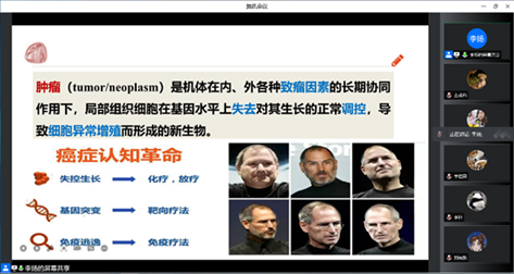 “肿瘤和癌症的区别是什么”,李扬老师先以生活中常遇到的问题为开头,抽丝剥茧地介绍了“肿瘤分为良性和恶性”和“会转移扩散的恶性肿瘤是癌症”的知识。随后李老师以苹果公司创始人乔布斯因患胰腺癌而去世的事迹,详细地讲解了患癌症后身体一步步瓦解的过程。为了帮助听众更易理解癌症的发病原因,李老师以“世界上癌症发病率最高的20个国家几乎全部都是发达国家”这一现象,向大家阐述,肿瘤发病率随人类平均寿命的提高而不断增长的事实,通过介绍肿瘤发病病因和“多环芳烃、甲醛、亚硝酸铵类、马兜铃酸、丙烯酰胺、酒精和真菌毒素”等几大致癌因子,指导大家在日常生活中如何有效远离癌症。李扬老师接着介绍了人类发明的两种抗癌手段——冰箱和EGFR单克隆抗体,这俩项都至少降低了50%癌症发病率,所以科学的进步,包括在抗癌上面,永远都不是渐进式的,而是阶梯式的、跳跃式的。最后,李扬老师劝导大家更应注重健康的生活习惯,而不是因担心一些未经证实的致癌因素对心理产生负面的影响,同时呼吁同学们对身边的癌症患者给予更多的关心关爱,萤火虽微,即使能够照亮一个小角落,也愿为其芒。
