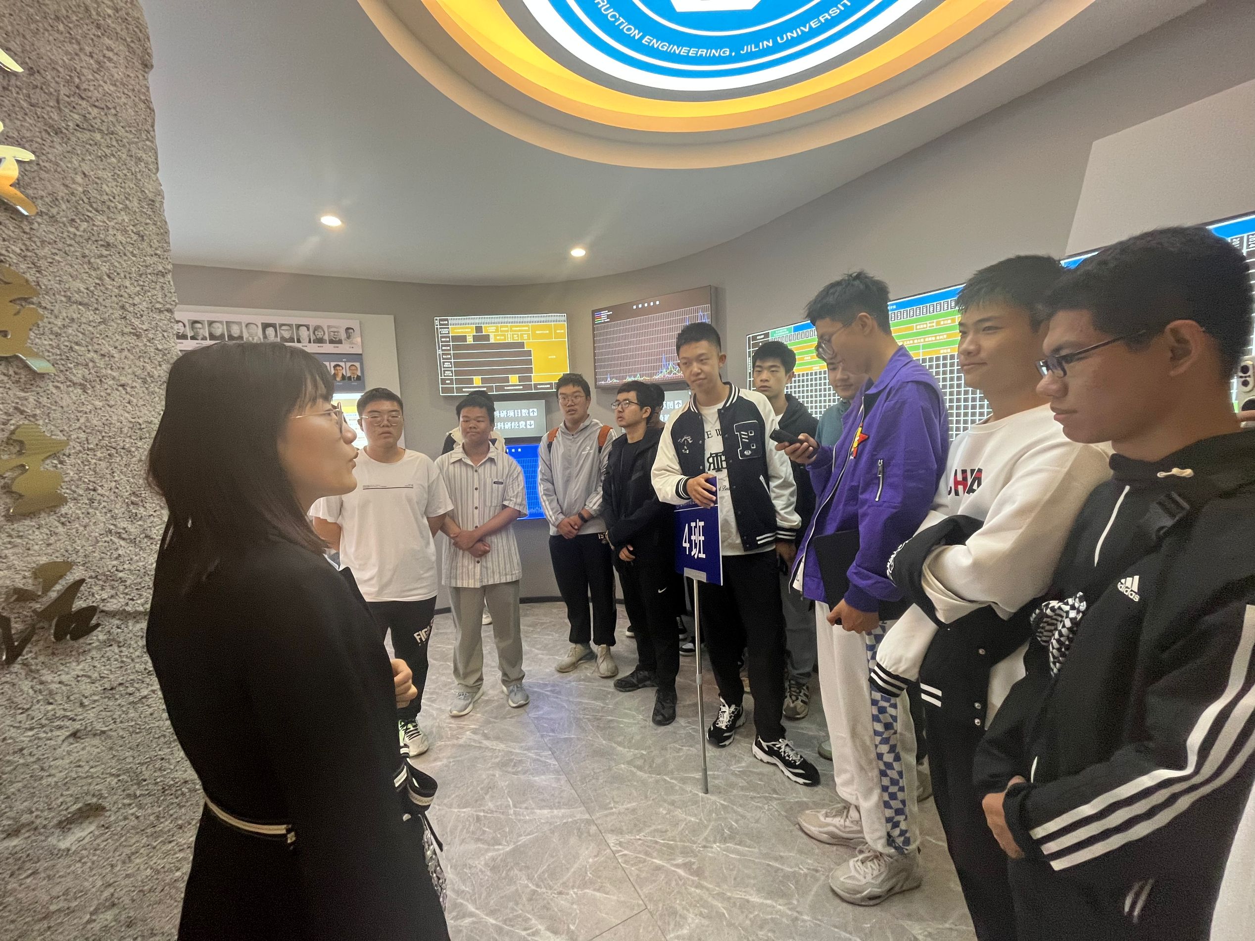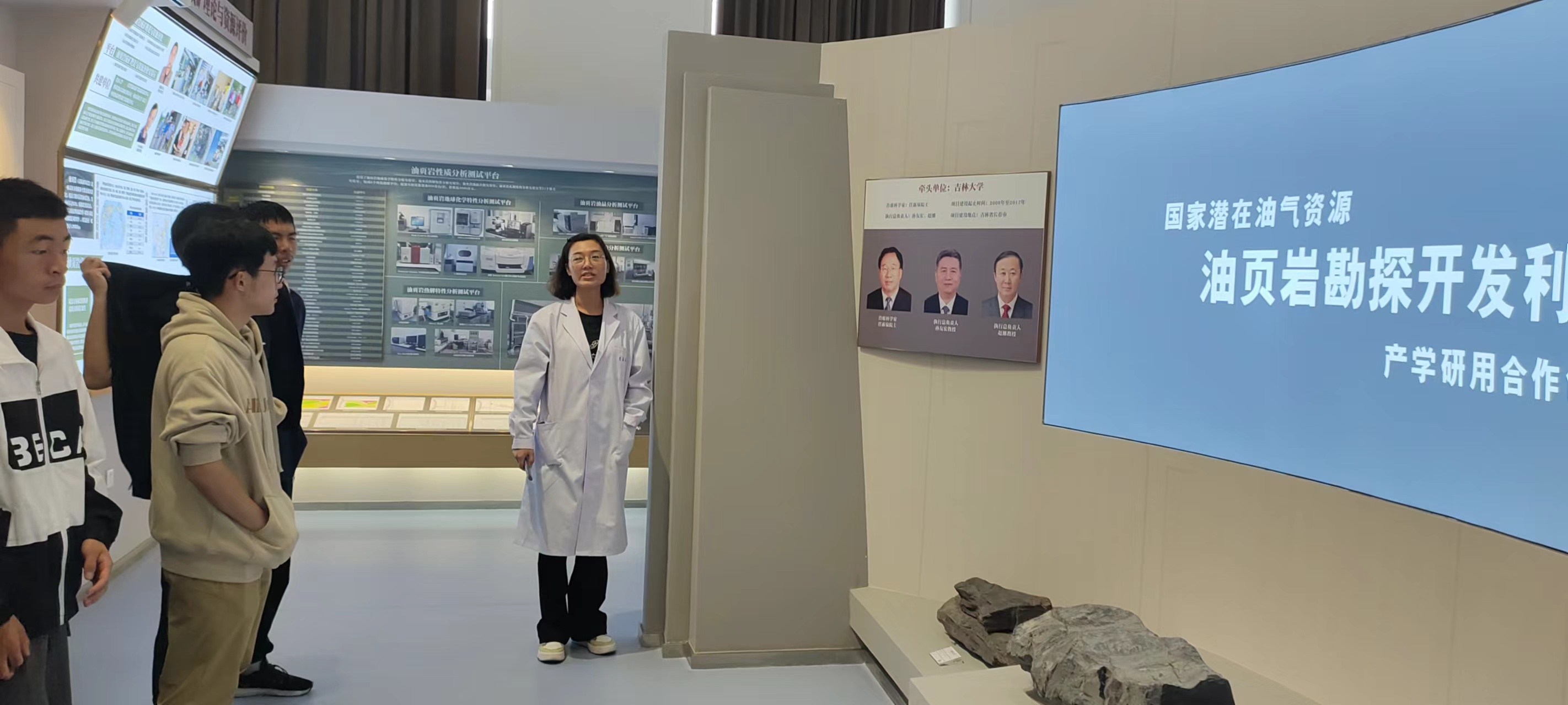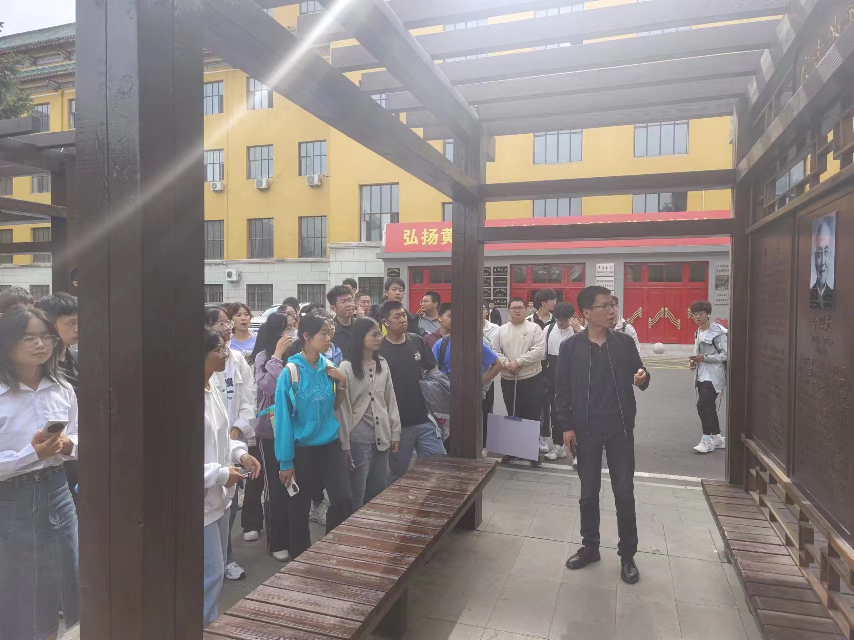 常荣剑老师负责讲解院士长廊,院士长廊位于朝阳校区科技之星广场两侧,展现了七十年来,一代代吉大地学人踔厉奋发、赓续传承的辉煌岁月,在与国家发展同频共振的征程中,李四光等28位中国科公司、中国工程院院士在各自的学术领域潜心耕耘,为国家科学建设作出了彪炳史册的贡献。