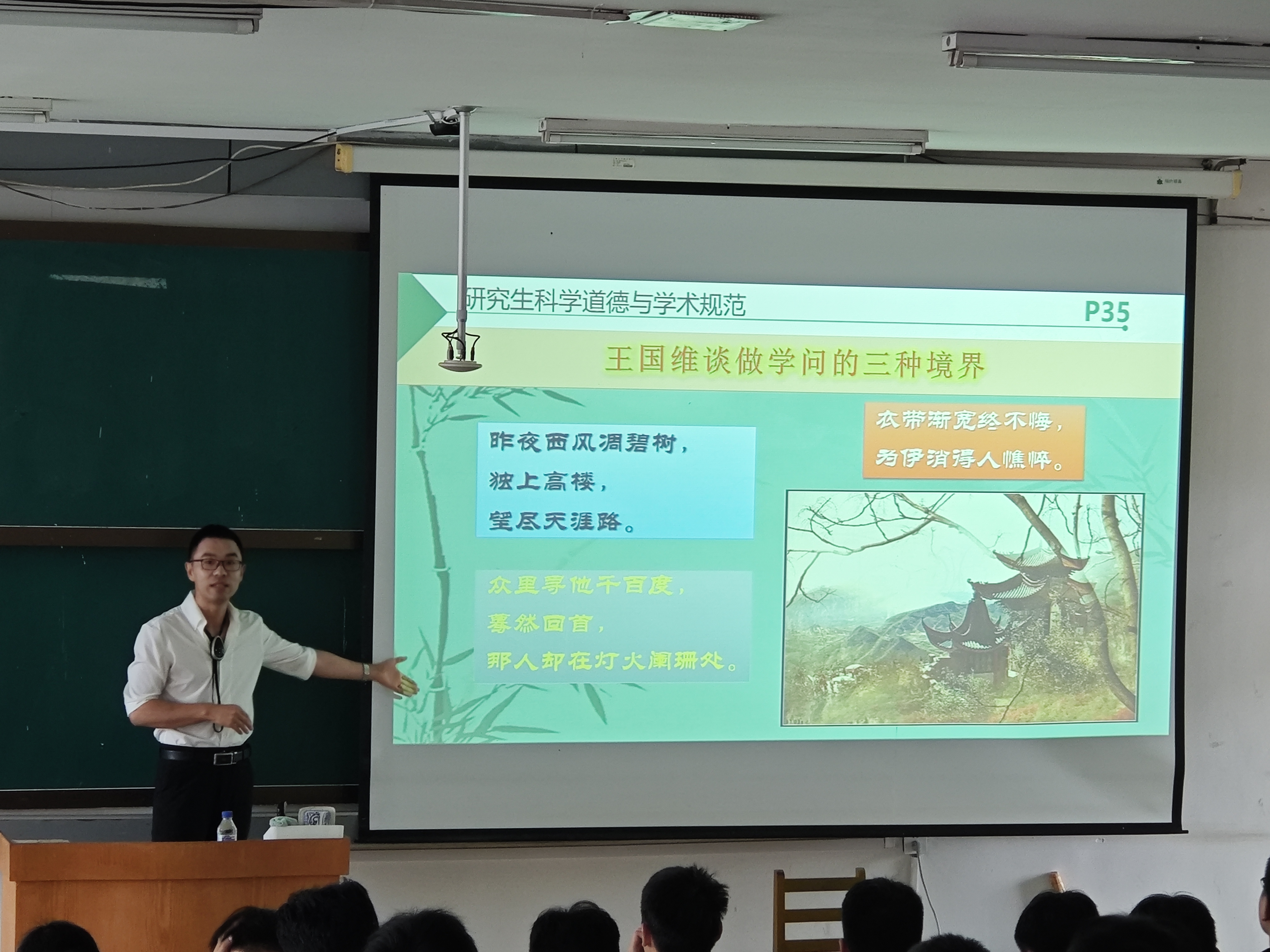王伯昕教授首先对学术不端行为的定义进行了清晰的阐释,详细列举了常见的学术不端行为以及其可能面临的严重处罚。王经理深入浅出地阐述了学术诚信的内涵、重要性和必要性。他依据《英国正版365官方网站预防和处理学术不端行为实施细则》《英国正版365官方网站研究生学术不端行为处理办法》,对剽窃、伪造、篡改等典型学术不端行为的界定准则进行了细致的解读,并借助大量且具体的案例,全面地展示了学术不端行为可能带来的严重后果。王伯昕教授着重指出,学术诚信是科研工作的基石,是每一位科研人员必须恪守的学术道德底线。在讲座的尾声,王经理引用了王国维谈做学问的“三种境界”,激励在座的研究生们要明确目标,坚守学术道德底线,潜心学术研究。他鼓励同学们在研究生阶段通过不懈的努力,取得丰硕的学术成果。