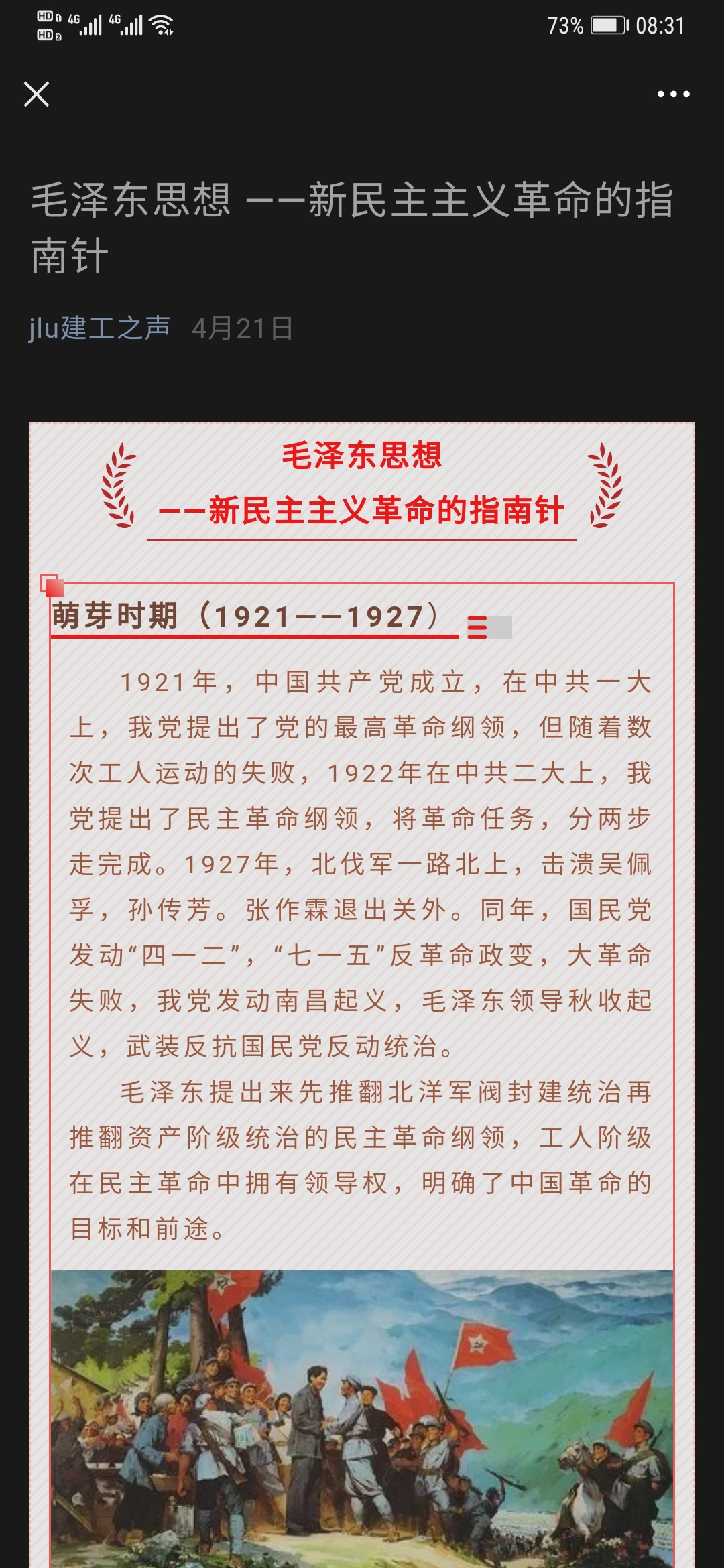 公司党委利用公司水工楼大厅电子屏幕,定期投送党史专题教育幻灯片,目前已经投送七个专题的学习内容;充分利用新媒体平台,在公司微信群中开展“党史百年天天读”活动,每天为教职工推送“党史上的今天”相关内容;利用公司“建工之声”微信公众平台,开展“毛泽东思想-新民主主义革命的指南针”线上学习活动,以及“开天辟地-中国共产党第一次全国代表大会”线上学习活动。