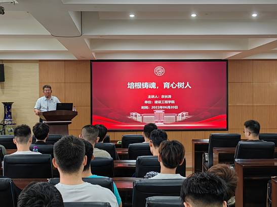 之后党委书记衣长涛以“培根铸魂,育心树人”为题,从爱国、实干、团结三个方面展开讲解,首先,引导大家培养爱国根基,“爱国不是一句口号”,要明确“为什么爱国”、“如何爱国”;其次,铸牢“实干”精神之魂,成功不是一蹴而就,成功需要从基层实干做起,积跬步才能致千里;第三,务必做到“团结”一心,有凝聚力、向心力、战斗力的团队所产生的能量是远远大于团队个体能量的累加。期间,衣长涛还讲述了刘国昌、张祖培、张秋生、张贻侠和黄大年等地学大家的光荣事迹。